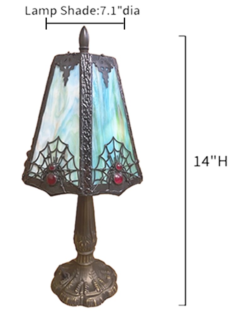 Hand made in the true tiffany method - foiled and soldered. The shade contains a spider web design with blue, green, & amber colors.